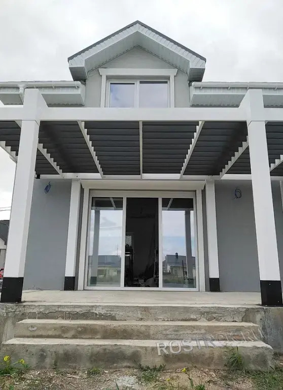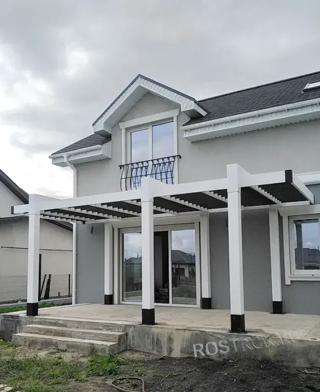 Мощный каркас: Используем массивные опорные столбы сечением 200х200 мм. Это придает конструкции статусность, надежность и визуальную «дороговизну».